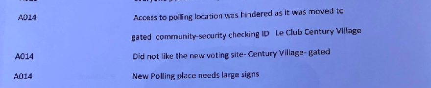 "Access to the polling station was hindered as it was moved to a gated community -- security checking ID," reads one complaint. A second read: "Did not like the new voting site - Century Village -- gated." The complaints were obtained by WLRN through a public records request sent in September.