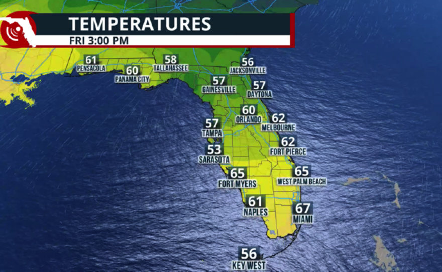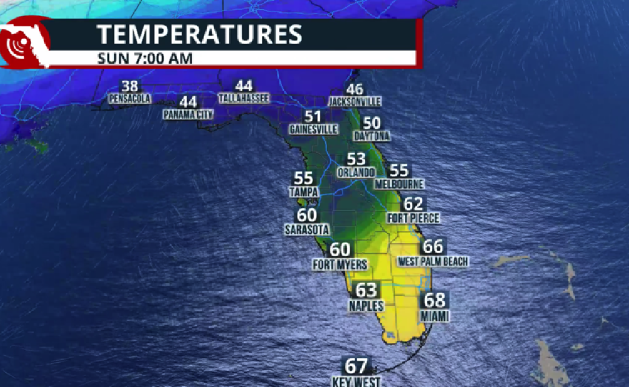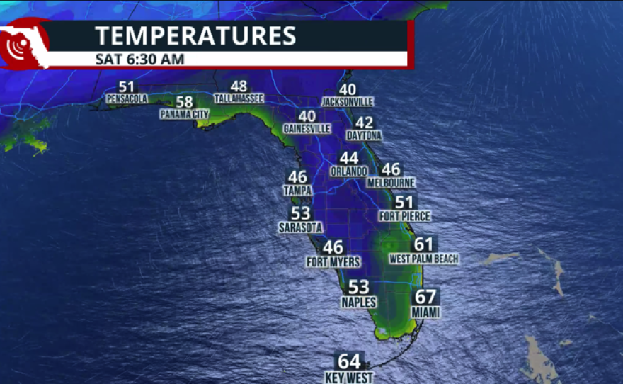 Although temperatures will moderate slightly, we still expect them to remain below average for this time of year statewide. We will continue to be under a high-pressure system that will gradually shift the winds and diminished them but the cooler air mass will stay in place keeping the temperatures on Saturday around the upper 60s to lower 70s across south Florida, Central Florida will stay with temperatures in the afternoon in the 60s while Saturday morning will be another cold one by Sunday morning temperatures will stay around the mid to upper 40s.