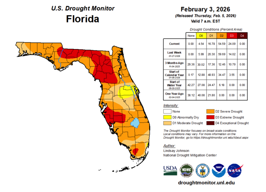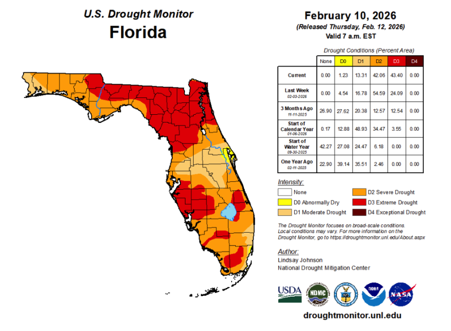 The drought continues to worsen across Florida. Now, 100% of the state is experiencing some form of drought. Compared to the previous week, the worst category that has almost doubled is the extreme category, which is level four out of five.