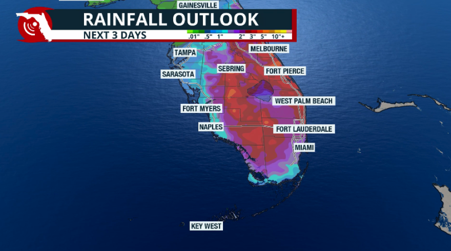 Keep in mind that these downpours and storms are falling on areas experiencing an extreme drought. There is a chance of isolated flash floods between Monday and Tuesday from Lake Okeechobee through southeast Florida, including highly populated areas such as Fort Lauderdale and Miami. Please stay away from flooded roads. Rainfall between Monday and Wednesday could range from 3 to 5 inches across inland areas around Lake Okeechobee through the Space Coast, Treasure Coast, and parts of southeast Florida. Some isolated spots over 5 inches.