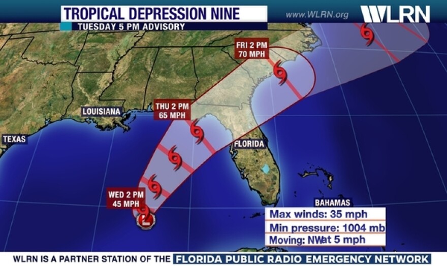 Even though Tropical Depression Nine hasn’t officially become a Tropical Storm yet, a Hurricane Watch was issued for Florida’s Gulf coast from Anclote River to Indian Pass. A Tropical Storm Watch is also in effect west of Indian Pass to the Walton/Bay County line.
