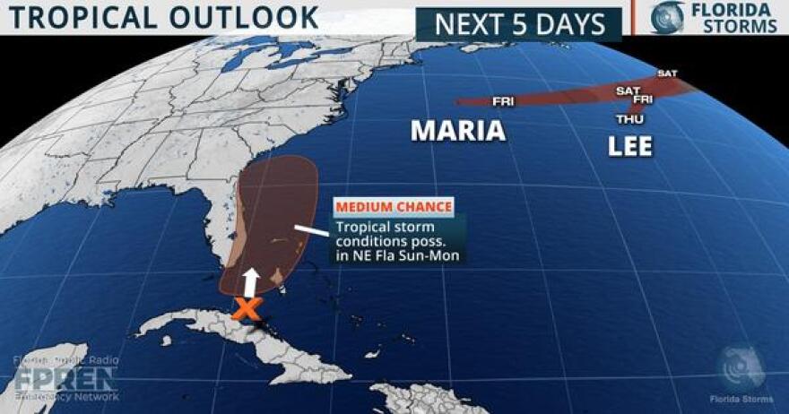 On Sunday, a strong ridge of high pressure is expected to move off the coast of the Mid-Atlantic states, preventing the tropical entity from moving any further north than offshore of the Florida-Georgia border. In fact, upper-level conditions are likely to become less favorable for continued tropical development early next week, and the area of low pressure is most likely to dissipate slowly and drift west across the state.