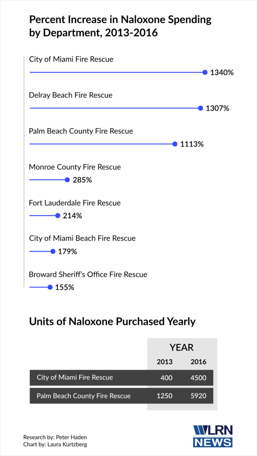 A WLRN analysis of eight major South Florida fire rescue departments shows spending on naloxone soared between 2013 and 2016.