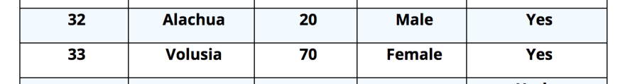 The following day, on March 13, the 24-year-old woman from Alachua County no longer appears on the table. But suddenly a 20-year-old male in Alachua County appears, without explanation.