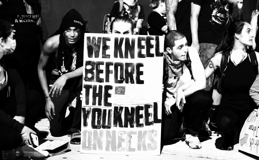 At intersections protesters stopped and took a knee, usually letting one of the organizers speak. During one stop protesters sang Happy Birthday to Breonna Taylor, a black woman who was killed by police in her home. The police say they were investigating a drug dealer but entered the wrong home. Taylor, an EMT, would have been 27 on Friday.