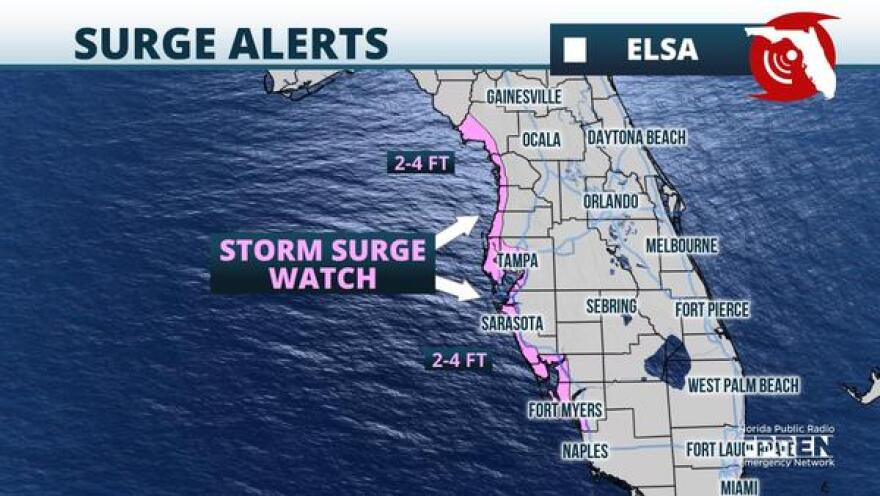 The first rain bands from Elsa over the Florida Keys are expected Monday afternoon, where Tropical Storm Watches remain in effect. Tropical storm force winds are likely, particularly over the lower and middle Keys late Monday afternoon into Monday night. The slower storm motion means any tropical storm force winds over South Florida would hold off until overnight Monday or at first light on Tuesday, favoring the Gulf side.