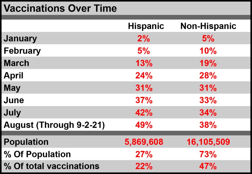 As of mid-September, 49% of Hispanics are vaccinated statewide, almost 10 percentage points higher than non-Hispanics.