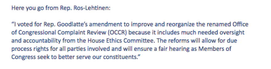 Ros-Lehtinen explained her original vote of “Yes” by saying oversight from Congress would ensure a “fair hearing” for members of Congress being investigated. Curbelo and U.S. Rep. Mario Diaz-Balart did not initially answer questions about how they voted.