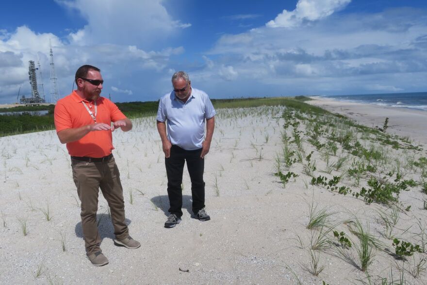 Scientists Don Dankert and Dr. Carlton Hall are helping in overseeing the building of dunes to shield launch infrastructure close enough to the ocean to suffer from corrosive salt spray.
