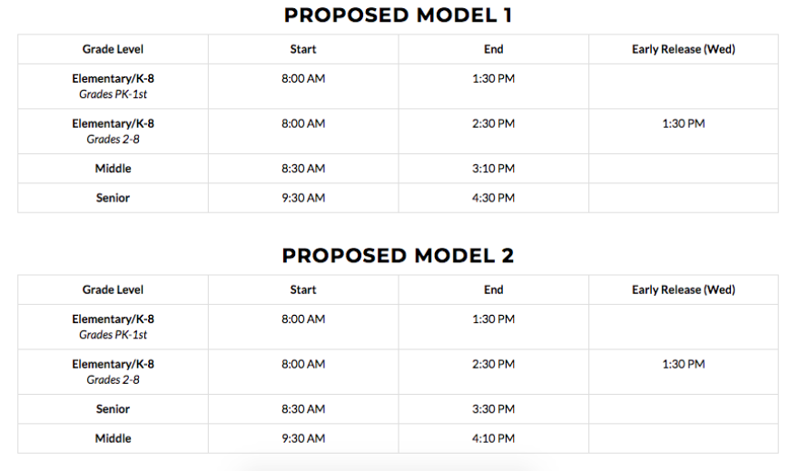 Under the new proposals, elementary schools would start at 8 a.m., and middle and high schools would start at either 8:30 or 9:30 a.m. The latest possible end time would be 4:30 p.m. The change could happen as soon as next school year or the year after, if it happens at all, Carvalho said.