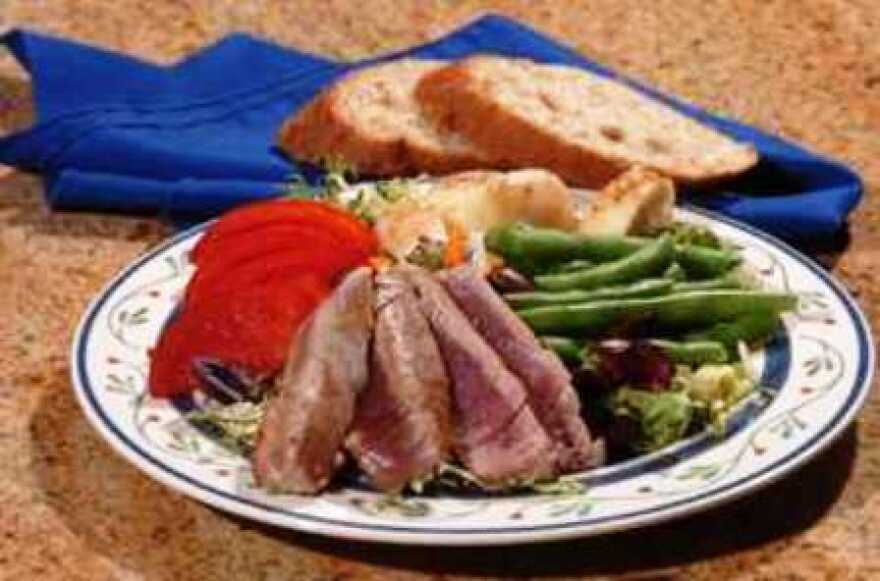 Here are the ingredients you’ll need for tonight’s Dinner in Minutes.To buy: 1/2 pound fresh green beans, 3/4 pound tuna steaks, 1 can small whole potatoes, 1 bag washed, ready-to-eat salad, 2 medium tomatoes, 1 small container black pitted olives, 1 can olive oil spray and 1 whole wheat baguette.