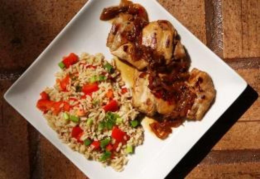 To buy: 3/4 pound boneless, skinless chicken legs, 1 small bottle white vinegar, 1 small bottle low-sodium soy sauce, 1 bottle honey, 1 package microwaveable brown rice, 1 red bell pepper and 1 bunch scallions.